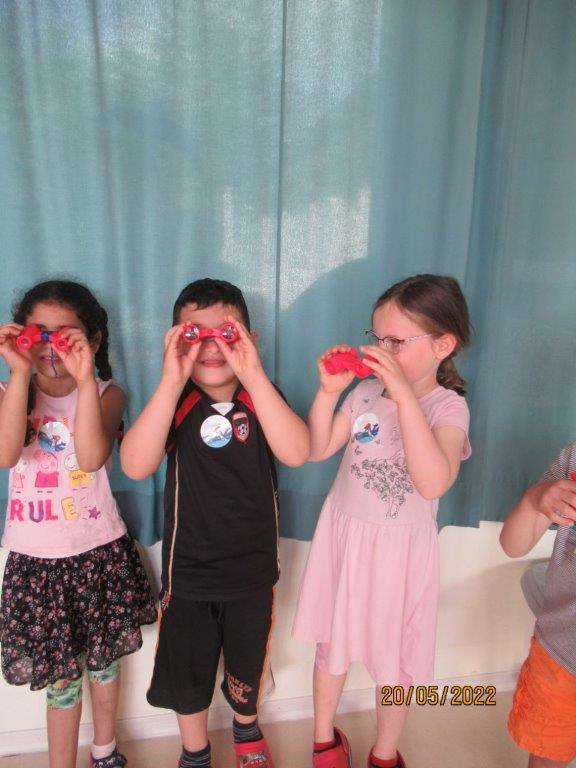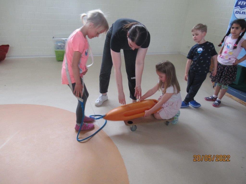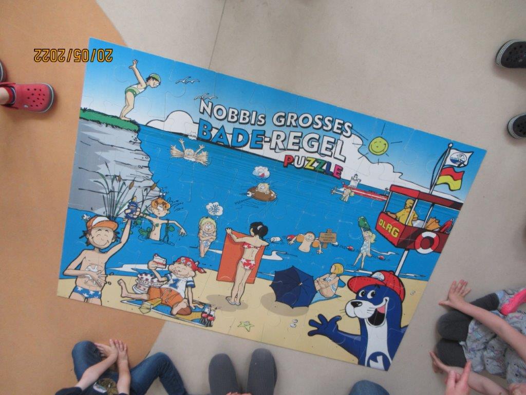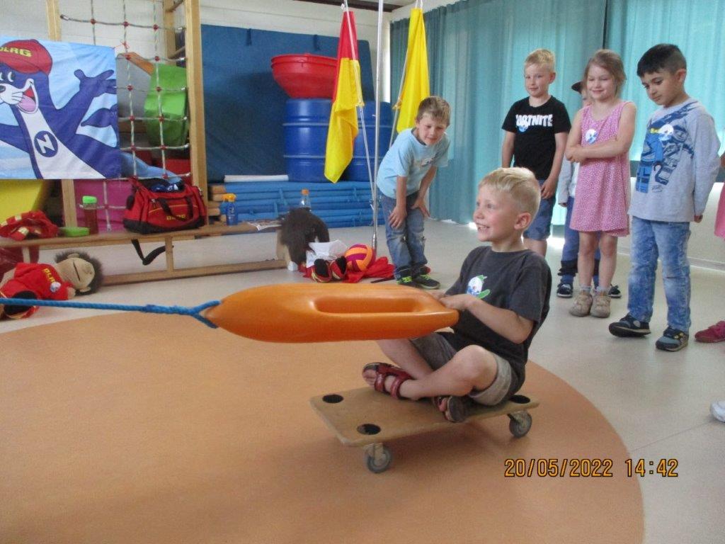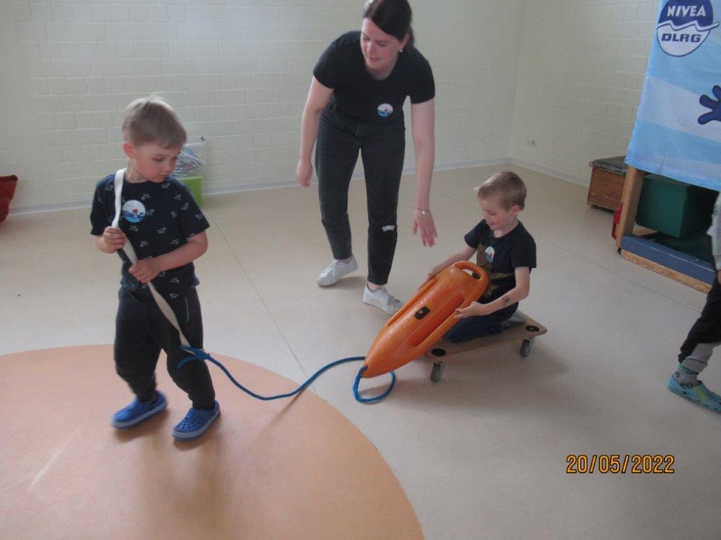 Die Kinder erleben spielerisch einen Tag am Strand. Sie hören wie weit ein Nichtschwimmer ins Wasser darf und werden auch zum Rettungsschwimmer.