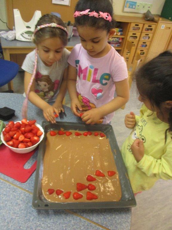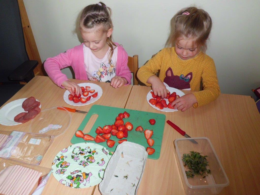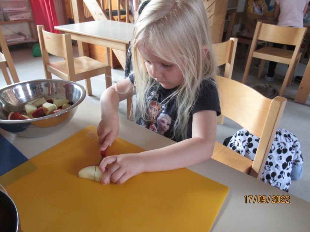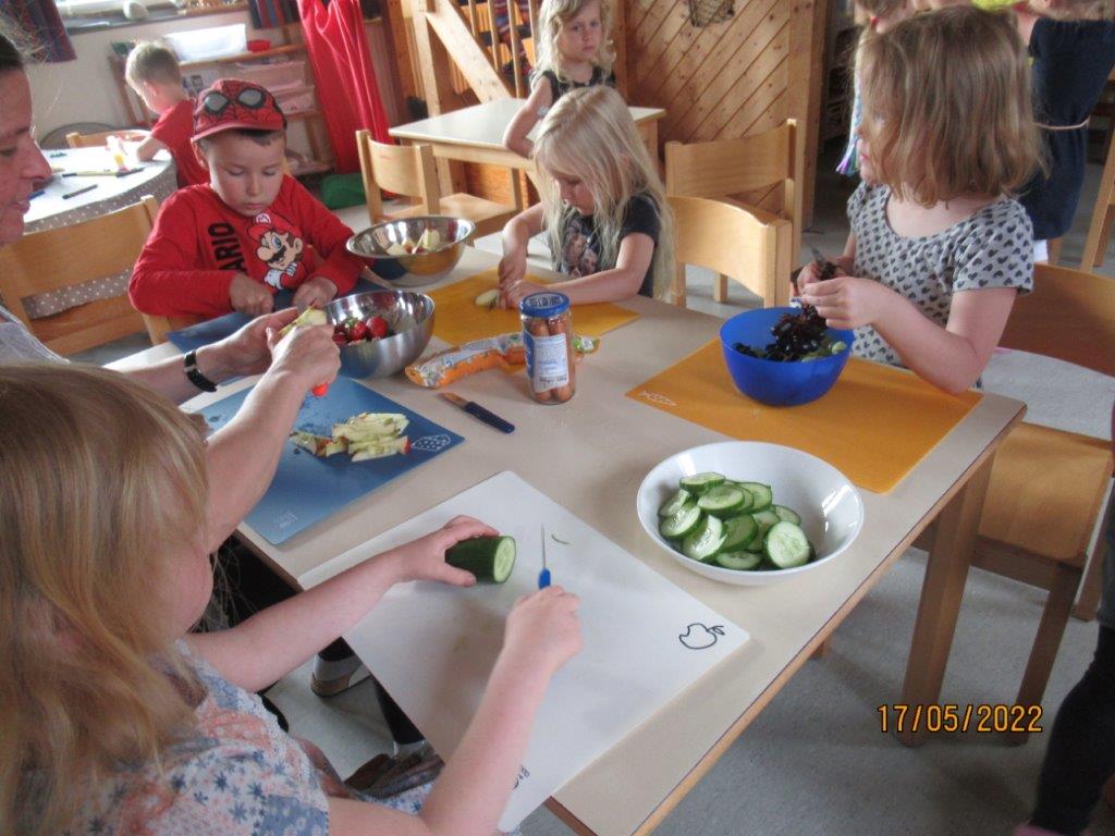 Am Koch-/ Back-Tag bereiten einige Kinder gemeinsam mit der Erzieherin das Gewünschte zu und am Ende wird das Ergebnis gemeinsam mit der ganzen Gruppe genossen.