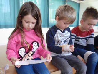 Der „Pflasterpass“ ist in mehreren Bereichen je nach Alter der Kinder aufgebaut. Die „Wuppis“ konnten an 2 Tagen ihren Bronze- und Silberkurs machen. Im Bronzekurs wurden die Kinder von „Igelchen“ und seinen Freunden begleitet, die den Kindern spielerisch und kindgerecht u.a. den Umgang des Notrufes erläuterten. Das Kennenlernen des Verbandkastens und natürlich das Ausprobieren eines Verbandanlegens gehörte am Vormittag dazu.
