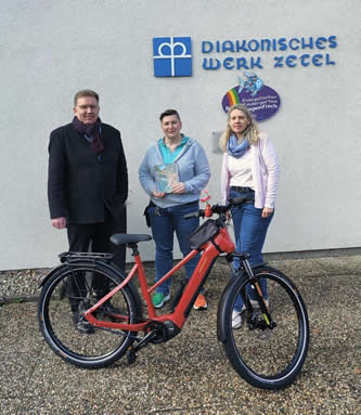 Das Diakonische Werk Zetel e. V. hat für seine Mitarbeitenden das Dienstrad-Leasing eingeführt. Somit wird den Mitarbeitenden ein Anreiz geboten, ein tolles E-Bike je nach Wunsch auszusuchen, damit zur Arbeit, aber auch in der Freizeit vermehrt Rad zu fahren und somit die Umwelt zu schonen. Nebenbei tun die Mitarbeitenden etwas für ihre Gesundheit und stärken das eigene Immunsystem. Die Kindergarten-Leiterin Maren Strey und der Geschäftsführer Frank Knoll gratulierten der ersten Dienstrad-Fahrerin Melanie Mannott zu ihrem neuen E-Bike mit einem Präsent und wünschen ihr und allen weiteren Dienstrad-Fahrenden allzeit gute Fahrt.